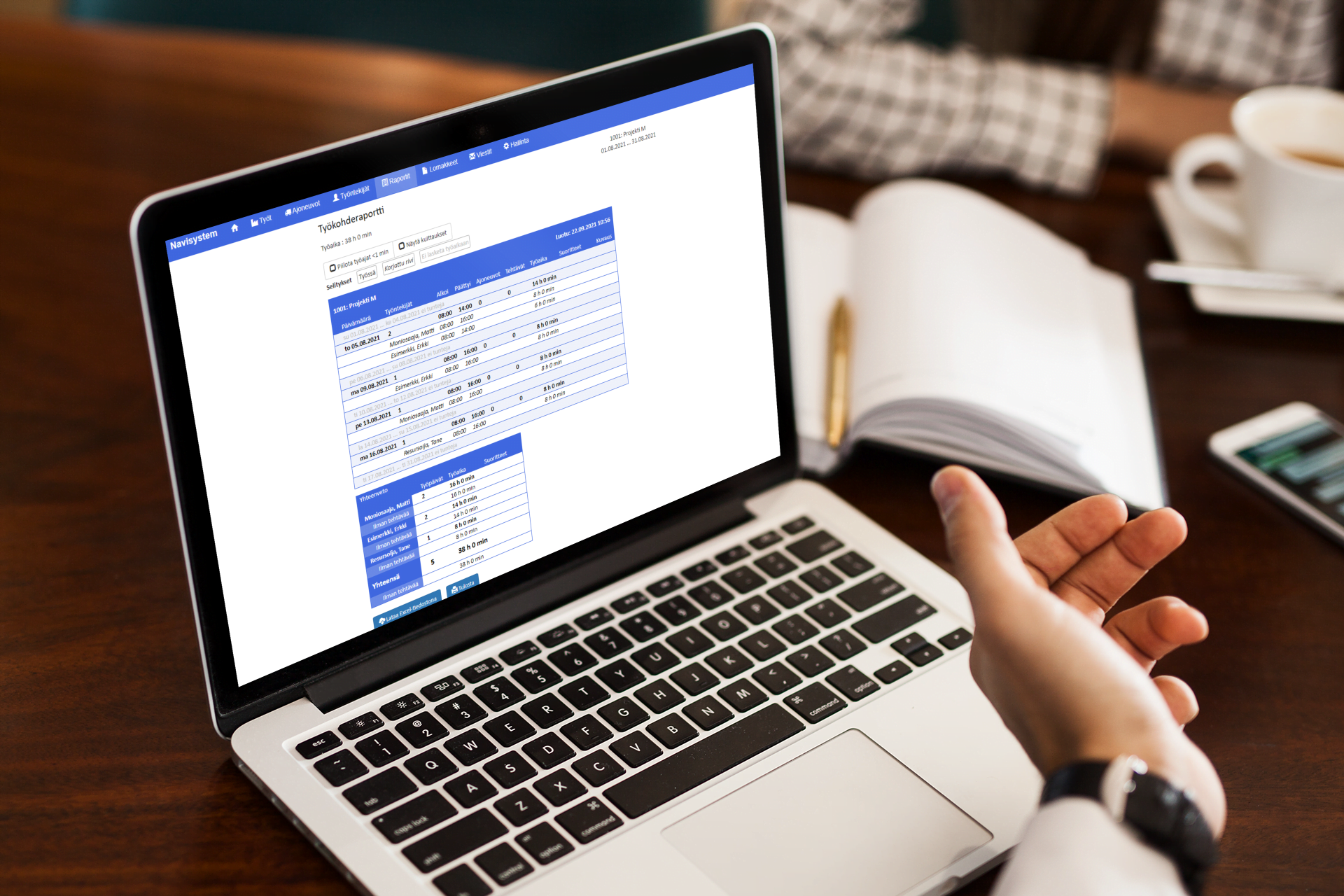 Raportista on helppo tarkistaa esimerkiksi työntekijöiden merkitsemän kokonaistyöajan sekä työkohde- että työntekijäkohtaisesti.