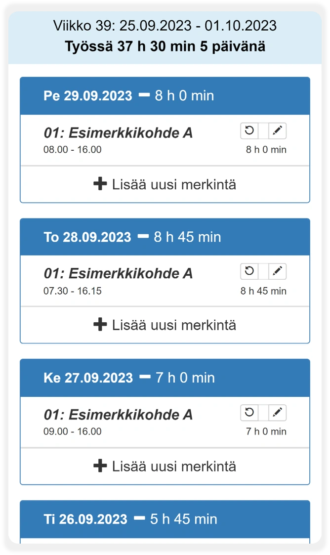 Myös uusien kirjausten lisääminen on mahdollista, mikäli käyttäjällä on oikeudet tähän. Joissain yrityksissä kaikki merkinnät tehdään tätä kautta tuntilappumaisesti