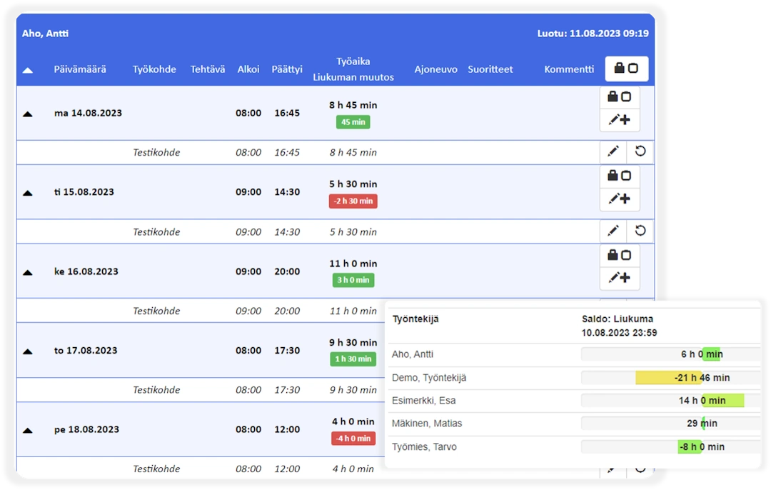 Työntekijän tuntiraportti näyttää saldojen muutokset