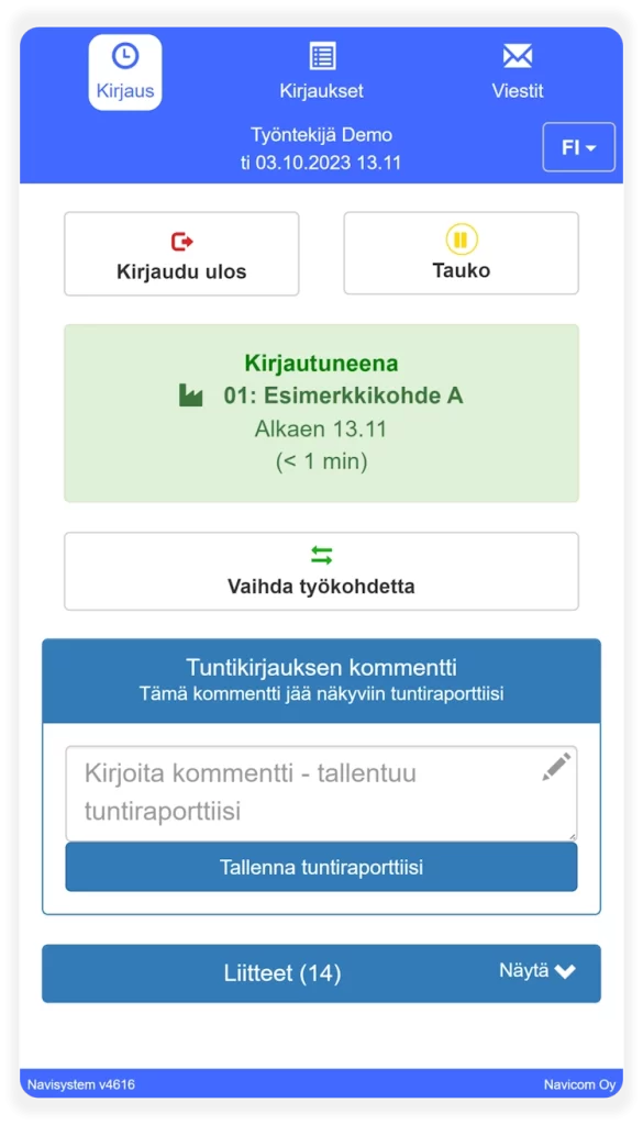 Navisystem helpottaa työntekijän raportointivelvoitteita esimerkiksi työn tilaajalle, projektihallintaan ja taloushallintaan. Tavallisen työaikaleimauksen aikana voidaan merkitä tai ilmoittaa työ valmiiksi, täyttää lomakkeita, lisätä palkanmaksu- ja laskutussuoritteita sekä muut yksityiskohdat kuten lomakkeet. Raportointi esim. projekti- ja taloushallintoon voidaan toteuttaa tarvittaessa rajapintojen avulla.