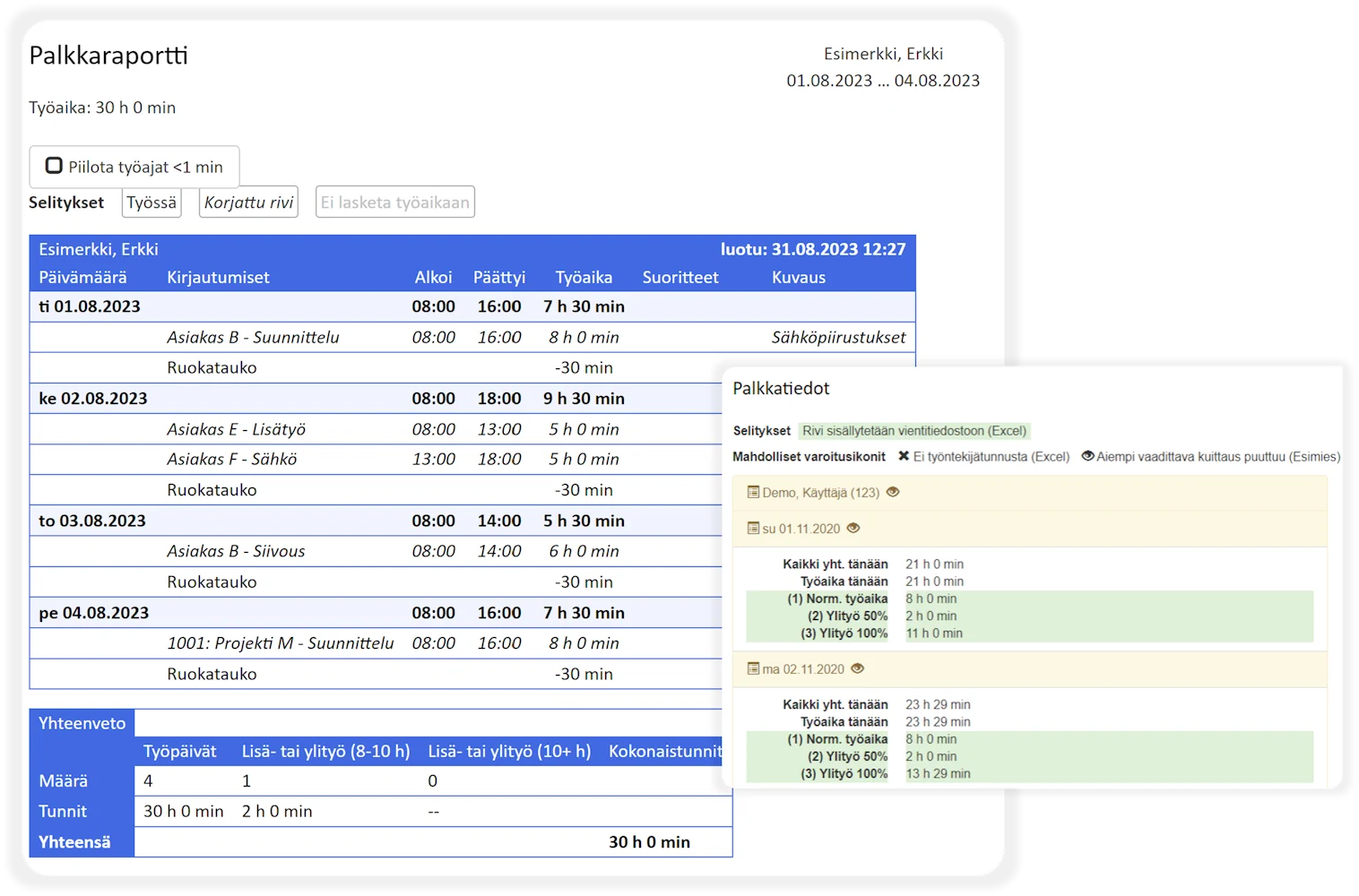 Raportissa voit myöst tarkastella työmerkintöjen muutoshistoriatietoja sekä tuntikirjanpidon hyväksyntä on mahdollista viidelle eri käyttäjäluokalle.