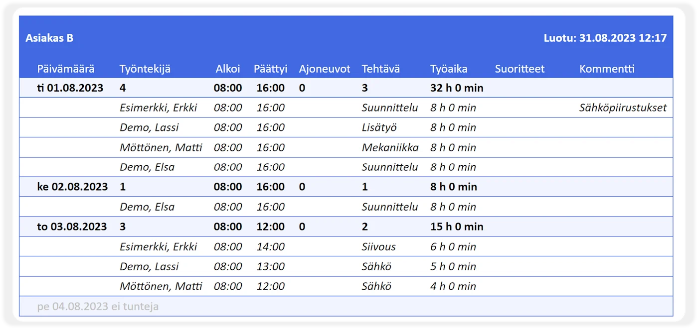 Työkohderaportti näyttää kaikki työkohteelle/asiakkaalle/projektille tehdyt työt työntekijäkohtaisesti